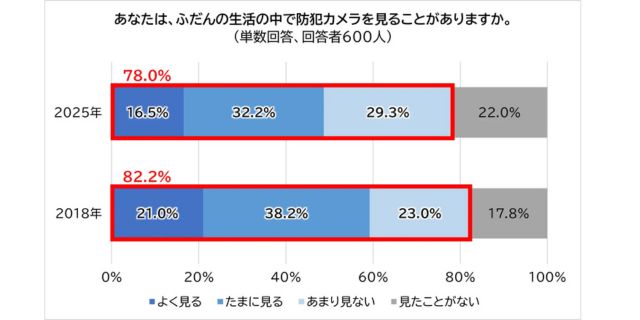 ALSOKが今年7月、日本在住の20代~70代以上の男女600人を対象に実施した「第3回 防犯カメラに関する意識調査」によると、回答者の78.0%が普段の生活の中で「防犯カメラを見ることがある」と回答。「あまり見ない」(29.3%)も含まれているが、8割近くがその存在を認識しているという結果は驚異的だろう。