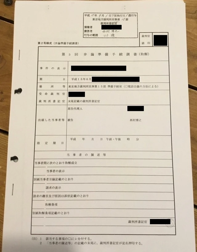 Aさんは弁護士を立て、「2ちゃんねる」の管理人であるひろゆき氏を被告として投稿者のIPアドレスの開示請求訴訟を提起した。そして、2003年6月、同訴訟の弁論準備手続きにおいて「裁判上の和解」が成立し、「調書」が作成された(【画像1】)。これにより、本件和解は確定判決と同一の効力をもっている(民事訴訟法267条参照)。
