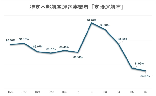 国土交通省の「特定本邦航空運送事業者に関する航空輸送サービスに係る情報」を見ると、国内の航空会社(特定本邦航空運送事業)の国内線における定時運航率(全体の便数に占める出発予定時刻以降15分以内に出発した便数の割合)は、令和5年度(2023年度)を境に急激に落ち込んでいる。